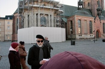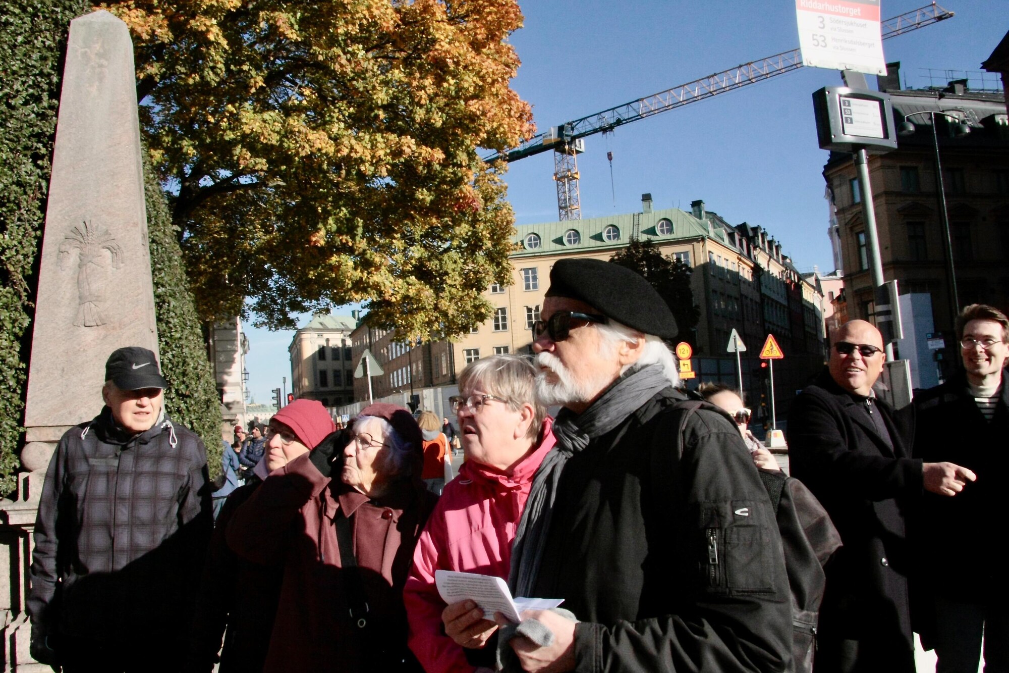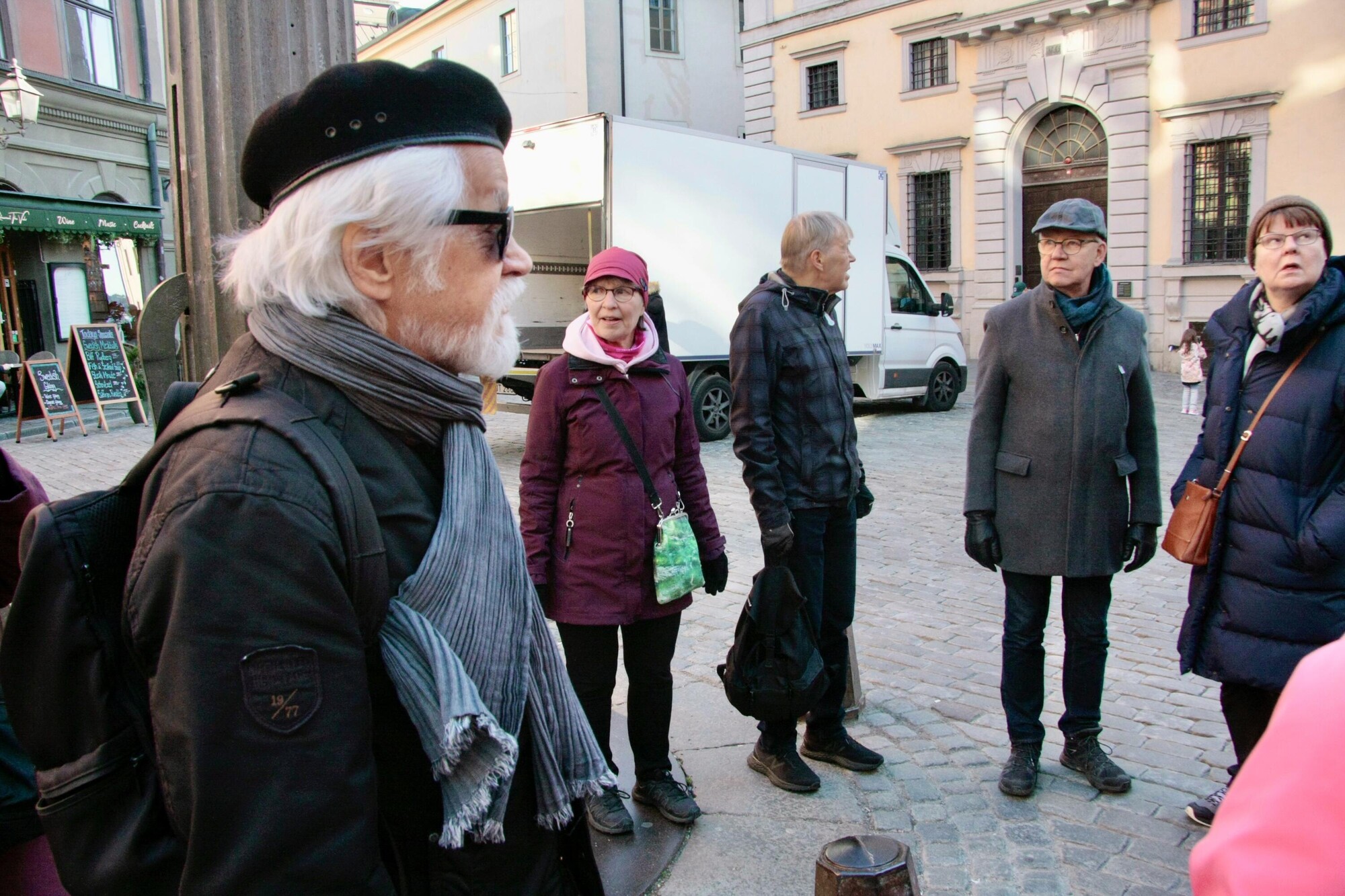 Stadsgårdenin satamasta pääjoukko käveli 1,3 kilometrin pituisen matkan Gamla Staniin eli Tukholman vanhaan kaupunkiin. Järntorgetilla (Rautatori) matkalaisia oli vastassa, Ruotsissa yli 40 vuotta asunut sarjakuvapiirtäjä, kuvittaja Markku Huovila.