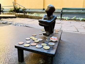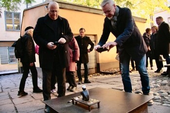 – Nyt olemme Tukholman Suomalaisen kirkon takapihalla. Täällä on Tukholman pienin patsas, jota turistit tulevat sankoin joukoin katsomaan. "Järnpojke" on noin 15 sentin korkuinen teos, jonka on tehnyt taiteilija Liss Eriksson, Huovila kertoi poiketessaan luovasti varsinaiselta reitiltä taiteen pariin.