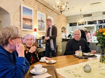 Suurkirkolta lukijamatkalaiset palasivat Suurtorille nauttimaan Det Grilliska Husetin suolaisista ja makeista antimista kahvin kera. Torin yhdessä sijaitsevan lounaskahvilan omistaa Stadsmission, ja se toiminut paikalla vuodesta 1649.