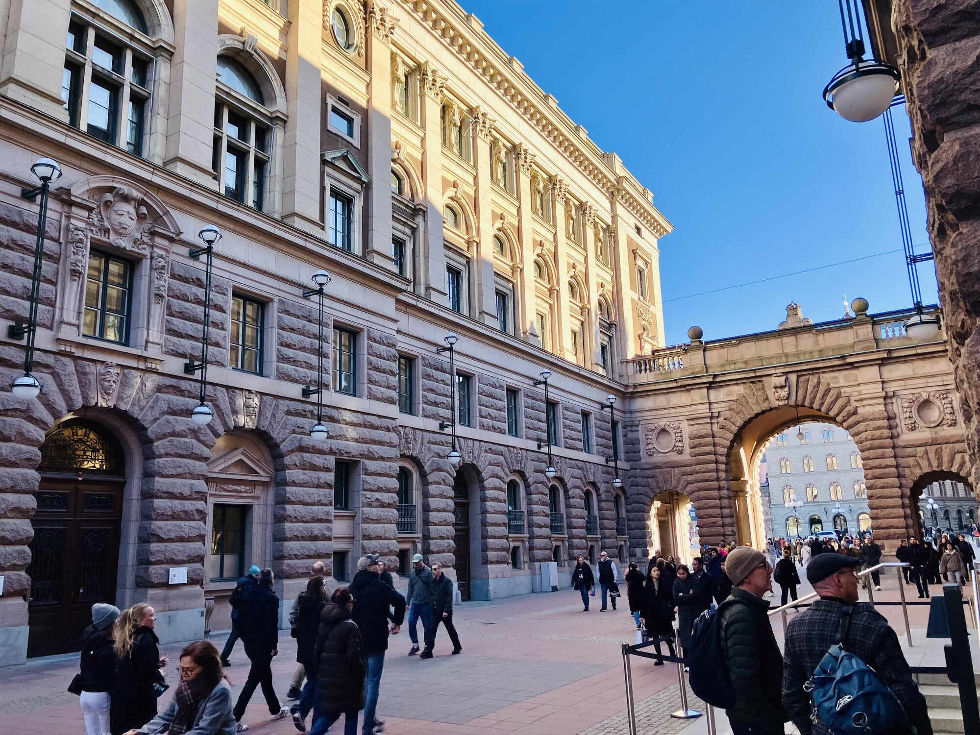 Puitteiltaan upeassa, mutta hintasoltaan edullisessa lounaskahvilassa vietetyn kahvituokion (fika) jälkeen kävelykierros jatkui Storkyrkobrinkenia alaspäin kohti Riddarhustorgetia.