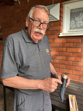 Toinen Lovénin huoltamista puukoista on hänen oma armeijapuukkonsa vuodelta 1964. Siitä on korjattu kahvan lakkaus, kiillotettu helat ja terä sekä pesty ja rasvattu tuppi.